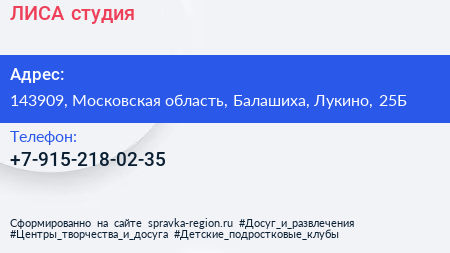 ЛИСА, студия по адресу 143909, Московская область, Балашиха, Лукино, 25Б в дальнейшем Организация, размещена в следующих категориях: