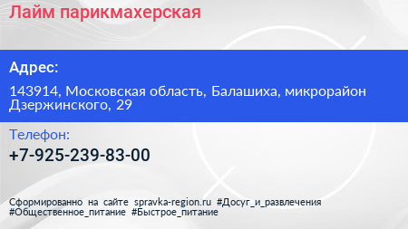 Лайм, парикмахерская по адресу 143914, Московская область, Балашиха, микрорайон Дзержинского, 29 в дальнейшем Организация, размещена в следующих категориях: