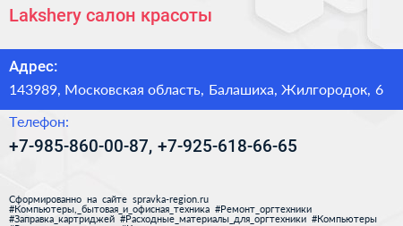 Lakshery, салон красоты по адресу 143989, Московская область, Балашиха, Жилгородок, 6 в дальнейшем Организация, размещена в следующих категориях: