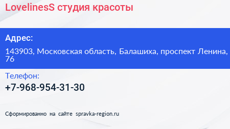 LovelinesS, студия красоты по адресу 143903, Московская область, Балашиха, проспект Ленина, 76 в дальнейшем Организация, размещена в следующих категориях: