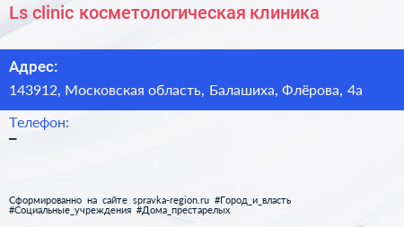 Ls clinic, косметологическая клиника по адресу 143912, Московская область, Балашиха, Флёрова, 4а в дальнейшем Организация, размещена в следующих категориях: