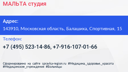 МАЛЬТА, студия по адресу 143910, Московская область, Балашиха, Спортивная, 15 в дальнейшем Организация, размещена в следующих категориях: