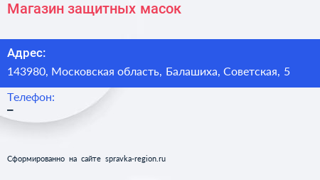 Магазин защитных масок по адресу 143980, Московская область, Балашиха, Советская, 5 в дальнейшем Организация, размещена в следующих категориях: