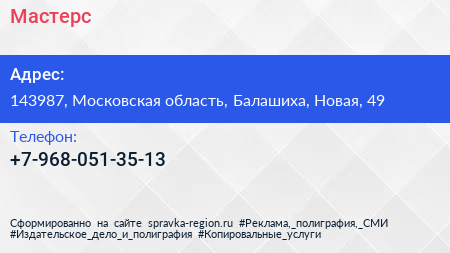 Мастерс по адресу 143987, Московская область, Балашиха, Новая, 49 в дальнейшем Организация, размещена в следующих категориях: