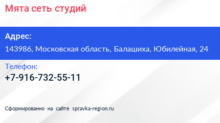 Мята, сеть студий по адресу 143986, Московская область, Балашиха, Юбилейная, 24 в дальнейшем Организация, размещена в следующих категориях: