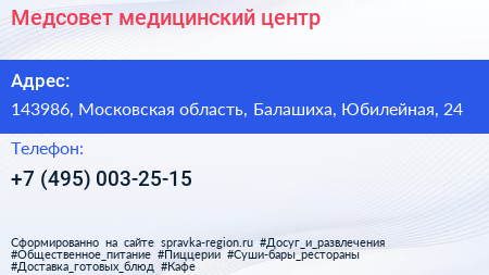 Медсовет, медицинский центр по адресу 143986, Московская область, Балашиха, Юбилейная, 24 в дальнейшем Организация, размещена в следующих категориях: