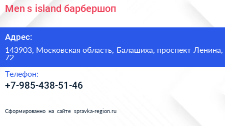 Men`s island, барбершоп по адресу 143903, Московская область, Балашиха, проспект Ленина, 72 в дальнейшем Организация, размещена в следующих категориях: