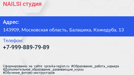 NAILSI, студия по адресу 143909, Московская область, Балашиха, Кожедуба, 13 в дальнейшем Организация, размещена в следующих категориях: