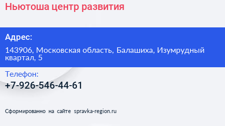 Ньютоша, центр развития по адресу 143906, Московская область, Балашиха, Изумрудный квартал, 5 в дальнейшем Организация, размещена в следующих категориях: