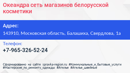 Океандра, сеть магазинов белорусской косметики по адресу 143910, Московская область, Балашиха, Свердлова, 1а в дальнейшем Организация, размещена в следующих категориях: