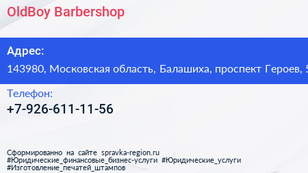 OldBoy Barbershop по адресу 143980, Московская область, Балашиха, проспект Героев, 5 в дальнейшем Организация, размещена в следующих категориях: