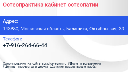 Остеопрактика, кабинет остеопатии по адресу 143980, Московская область, Балашиха, Октябрьская, 33 в дальнейшем Организация, размещена в следующих категориях: