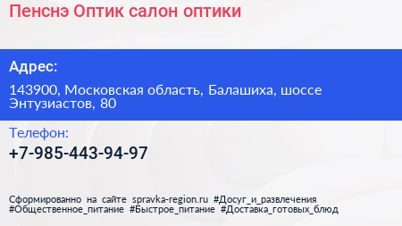 Пенснэ Оптик, салон оптики по адресу 143900, Московская область, Балашиха, шоссе Энтузиастов, 80 в дальнейшем Организация, размещена в следующих категориях:
