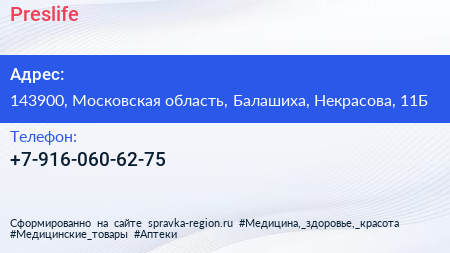 Preslife по адресу 143900, Московская область, Балашиха, Некрасова, 11Б в дальнейшем Организация, размещена в следующих категориях: