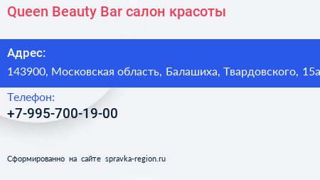 Queen Beauty Bar, салон красоты по адресу 143900, Московская область, Балашиха, Твардовского, 15а в дальнейшем Организация, размещена в следующих категориях: