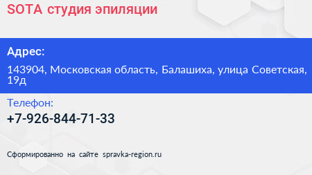 SOTA, студия эпиляции по адресу 143904, Московская область, Балашиха, улица Советская, 19д в дальнейшем Организация, размещена в следующих категориях: