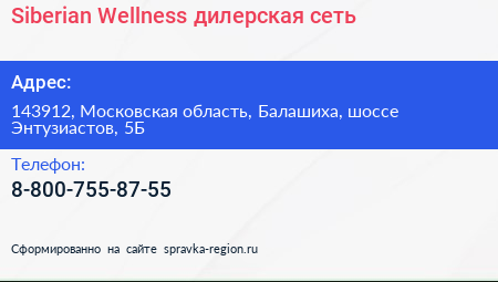 Siberian Wellness, дилерская сеть по адресу 143912, Московская область, Балашиха, шоссе Энтузиастов, 5Б в дальнейшем Организация, размещена в следующих категориях: