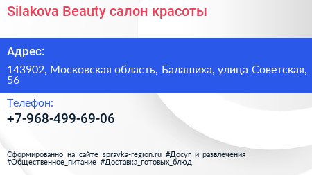 Silakova Beauty, салон красоты по адресу 143902, Московская область, Балашиха, улица Советская, 56 в дальнейшем Организация, размещена в следующих категориях: