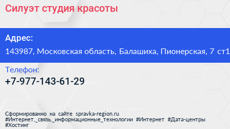 Силуэт, студия красоты по адресу 143987, Московская область, Балашиха, Пионерская, 7 ст1 в дальнейшем Организация, размещена в следующих категориях: