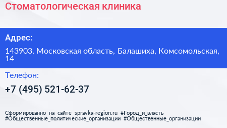 Стоматологическая клиника по адресу 143903, Московская область, Балашиха, Комсомольская, 14 в дальнейшем Организация, размещена в следующих категориях: