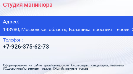 Студия маникюра по адресу 143980, Московская область, Балашиха, проспект Героев, 3 в дальнейшем Организация, размещена в следующих категориях:
