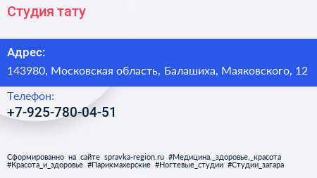 Студия тату по адресу 143980, Московская область, Балашиха, Маяковского, 12 в дальнейшем Организация, размещена в следующих категориях: