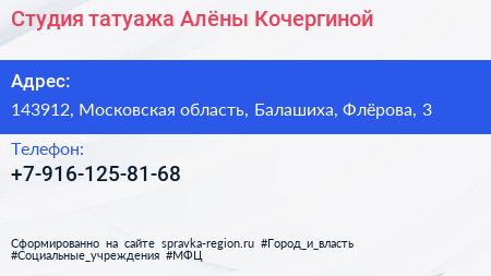 Студия татуажа Алёны Кочергиной по адресу 143912, Московская область, Балашиха, Флёрова, 3 в дальнейшем Организация, размещена в следующих категориях: