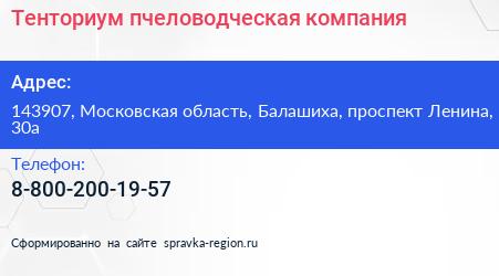 Тенториум, пчеловодческая компания по адресу 143907, Московская область, Балашиха, проспект Ленина, 30а в дальнейшем Организация, размещена в следующих категориях: