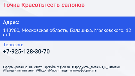 Точка Красоты, сеть салонов по адресу 143980, Московская область, Балашиха, Маяковского, 12 ст1 в дальнейшем Организация, размещена в следующих категориях: