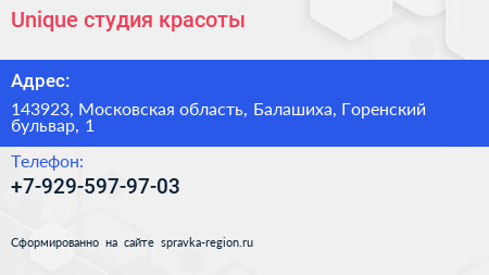 Unique, студия красоты по адресу 143923, Московская область, Балашиха, Горенский бульвар, 1 в дальнейшем Организация, размещена в следующих категориях: