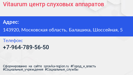 Vitaurum, центр слуховых аппаратов по адресу 143920, Московская область, Балашиха, Шоссейная, 5 в дальнейшем Организация, размещена в следующих категориях: