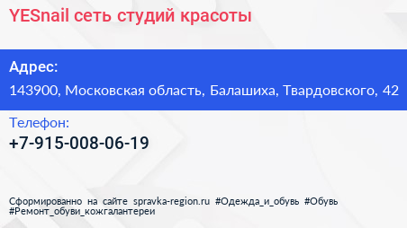 YESnail, сеть студий красоты по адресу 143900, Московская область, Балашиха, Твардовского, 42 в дальнейшем Организация, размещена в следующих категориях: