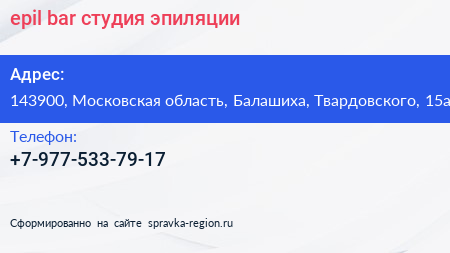 epil. bar, студия эпиляции по адресу 143900, Московская область, Балашиха, Твардовского, 15а в дальнейшем Организация, размещена в следующих категориях: