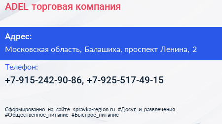 ADEL, торговая компания по адресу Московская область, Балашиха, проспект Ленина, 2 в дальнейшем Организация, размещена в следующих категориях: