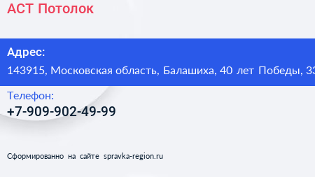 АСТ-Потолок по адресу 143915, Московская область, Балашиха, 40 лет Победы, 33 в дальнейшем Организация, размещена в следующих категориях: