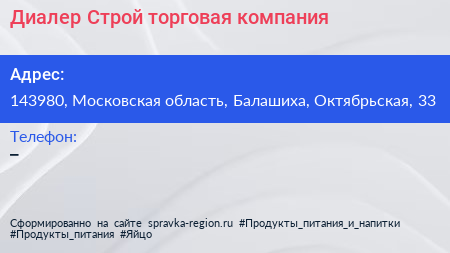 Диалер-Строй, торговая компания по адресу 143980, Московская область, Балашиха, Октябрьская, 33 в дальнейшем Организация, размещена в следующих категориях: