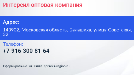 Интерсил, оптовая компания по адресу 143902, Московская область, Балашиха, улица Советская, 32 в дальнейшем Организация, размещена в следующих категориях: