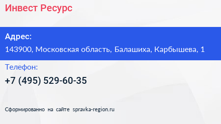 Инвест-Ресурс по адресу 143900, Московская область, Балашиха, Карбышева, 1 в дальнейшем Организация, размещена в следующих категориях:
