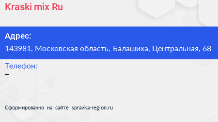 Kraski-mix.Ru по адресу 143981, Московская область, Балашиха, Центральная, 68 в дальнейшем Организация, размещена в следующих категориях: