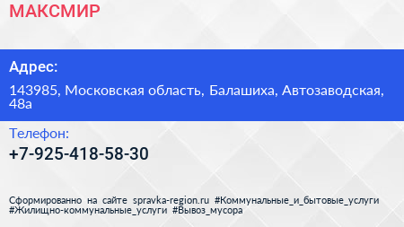 МАКСМИР по адресу 143985, Московская область, Балашиха, Автозаводская, 48а в дальнейшем Организация, размещена в следующих категориях:
