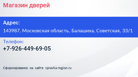 Магазин дверей по адресу 143987, Московская область, Балашиха, Советская, 33/1 в дальнейшем Организация, размещена в следующих категориях: