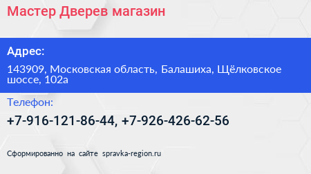 Мастер Дверев, магазин по адресу 143909, Московская область, Балашиха, Щёлковское шоссе, 102а в дальнейшем Организация, размещена в следующих категориях: