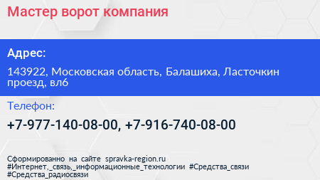 Мастер ворот, компания по адресу 143922, Московская область, Балашиха, Ласточкин проезд, вл6 в дальнейшем Организация, размещена в следующих категориях:
