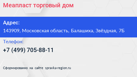 Меапласт, торговый дом по адресу 143909, Московская область, Балашиха, Звёздная, 7Б в дальнейшем Организация, размещена в следующих категориях: