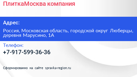 ПлиткаМосква, компания по адресу Россия, Московская область, городской округ Люберцы, деревня Марусино, 1А в дальнейшем Организация, размещена в следующих категориях:
