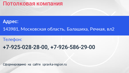 Потолковая компания по адресу 143981, Московская область, Балашиха, Речная, вл2 в дальнейшем Организация, размещена в следующих категориях:
