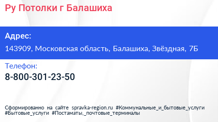 Ру Потолки, г. Балашиха по адресу 143909, Московская область, Балашиха, Звёздная, 7Б в дальнейшем Организация, размещена в следующих категориях: