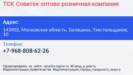 ТСК Совитек, оптово-розничная компания по адресу 143902, Московская область, Балашиха, Текстильщиков, 10 в дальнейшем Организация, размещена в следующих категориях: