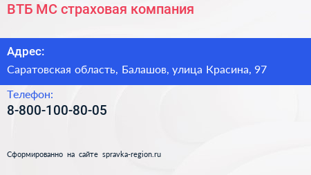 ВТБ МС, страховая компания по адресу Саратовская область, Балашов, улица Красина, 97 в дальнейшем Организация, размещена в следующих категориях: