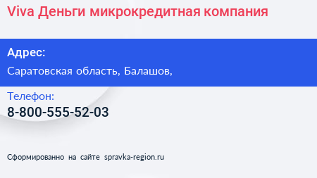Viva Деньги, микрокредитная компания по адресу Саратовская область, Балашов, в дальнейшем Организация, размещена в следующих категориях: